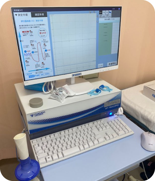 ノ-ズクリップで鼻をつまみマウスピ-スを口にくわえて検査します。技師の掛け声にあわせて検査します。