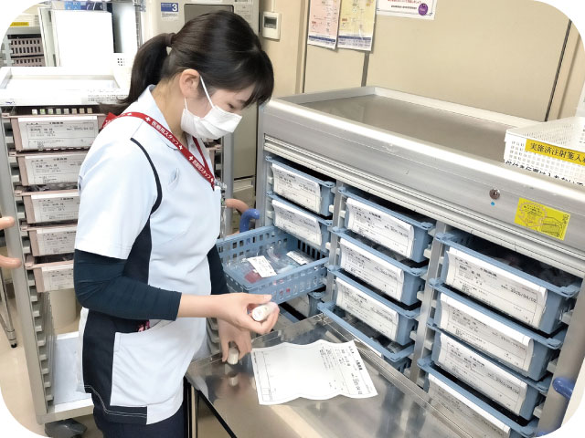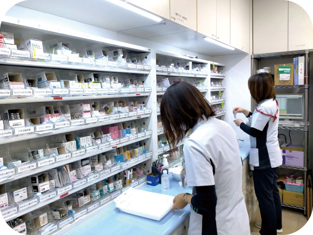 入院患者さんに対して適正に薬が使用されているか、副作用が現れていないかの確認や薬の効果や使い方の説明、相談対応を行い有効で安全な薬物治療を受けられるよう支援しています。