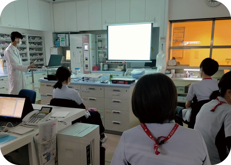 まずは調剤業務や医薬品管理業務、注射業務等の実務を体験し、臨床での薬物療法に対する理解を深めます。その他NSTやICTなど院内多職種のチーム医療や薬剤管理指導業務、病棟薬剤業務等で経験を重ねます。薬剤師の指導のもと抗がん剤の無菌調製も行い、実習の最後には実習期間中に学んだことを報告会として実習生1人ずつ発表してもらっています。